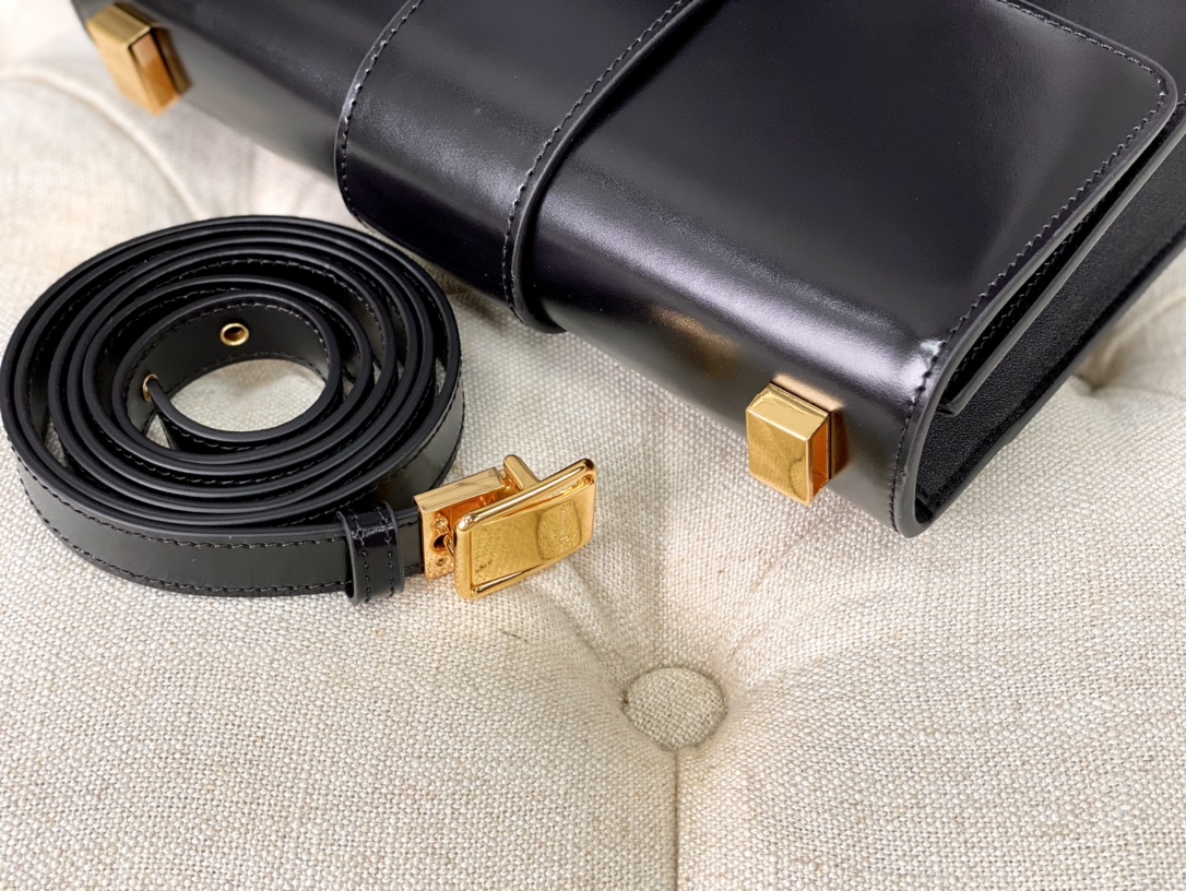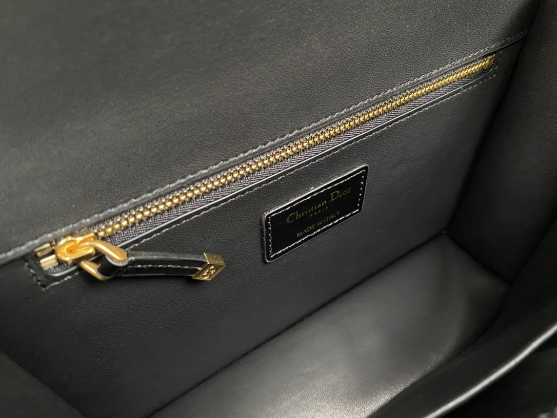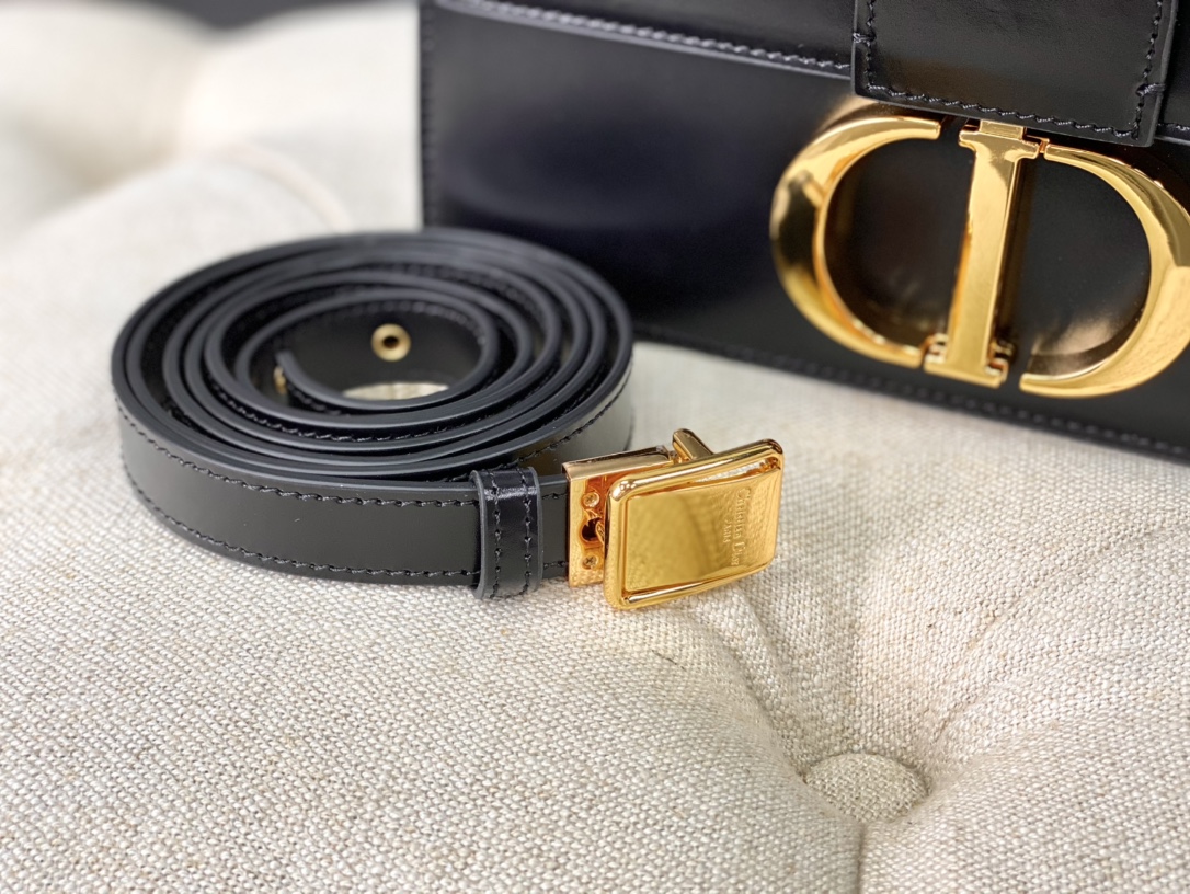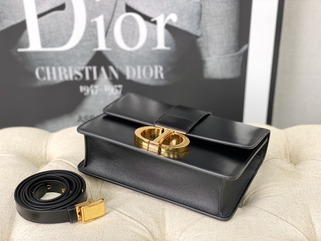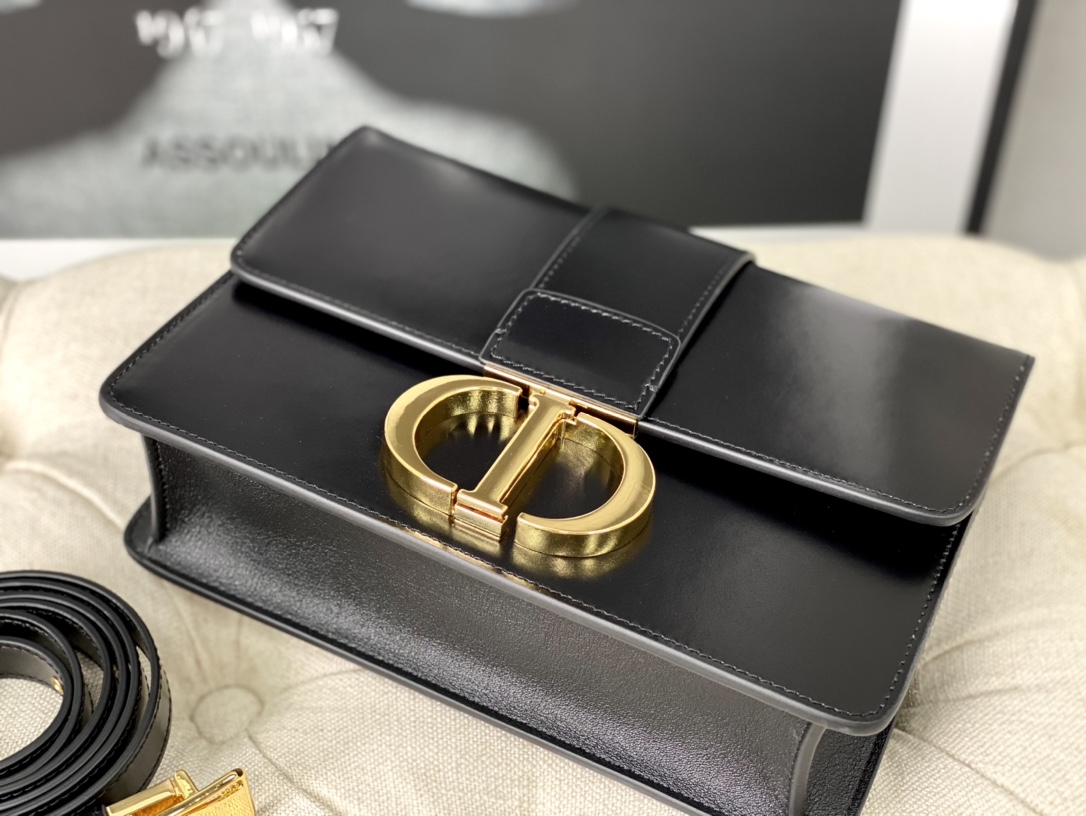 The 30 Montaigne line is inspired by the emblematic address and offers essential pieces that embody the House's iconic codes. The handbag is crafted in black box calfskin for an elegant and modern look. The flap is embellished with an antique gold-finish metal 'CD' clasp, inspired by the seal of a Christian Dior perfume bottle. Refined details, such as an embossed '30 MONTAIGNE' signature on the back, define this unique design. Featuring an adjustable leather shoulder strap, the bag may be carried by hand, worn over the shoulder or crossbody.