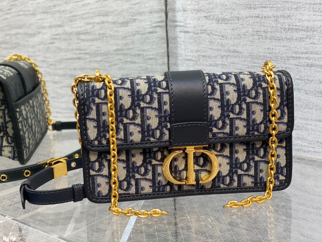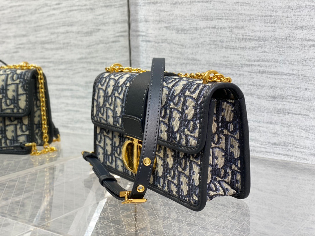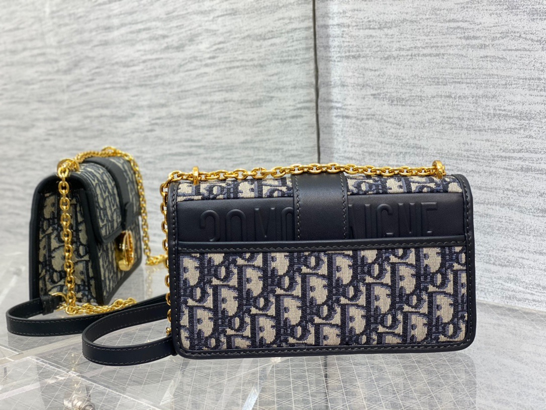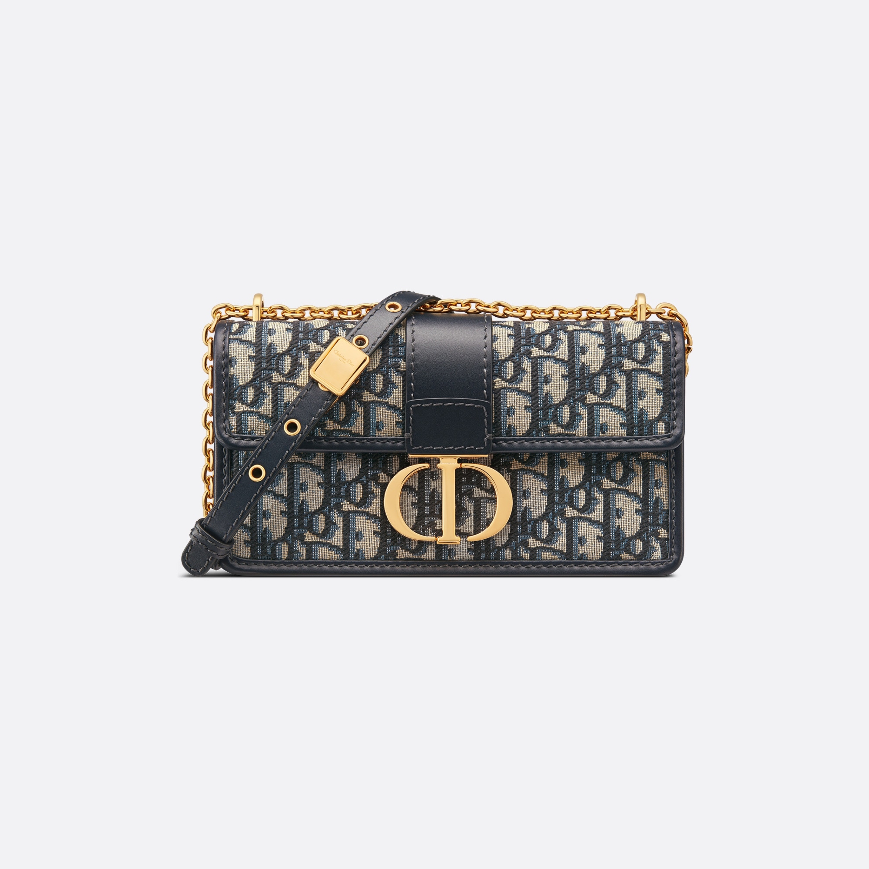 The East-West bag with chain enhances the 30 Montaigne line with a timeless and elegant design. The handbag is crafted in blue jacquard and highlights the House's hallmark Dior Oblique motif. The flap has an antique gold-finish metal CD clasp, inspired by the seal of a Christian Dior perfume bottle. Other details, like the embossed 30 Montaigne signature on the back, highlight the streamlined design. The bag features a removable chain strap with a leather insert that allows it to be comfortably carried by hand, worn over the shoulder or crossbody.