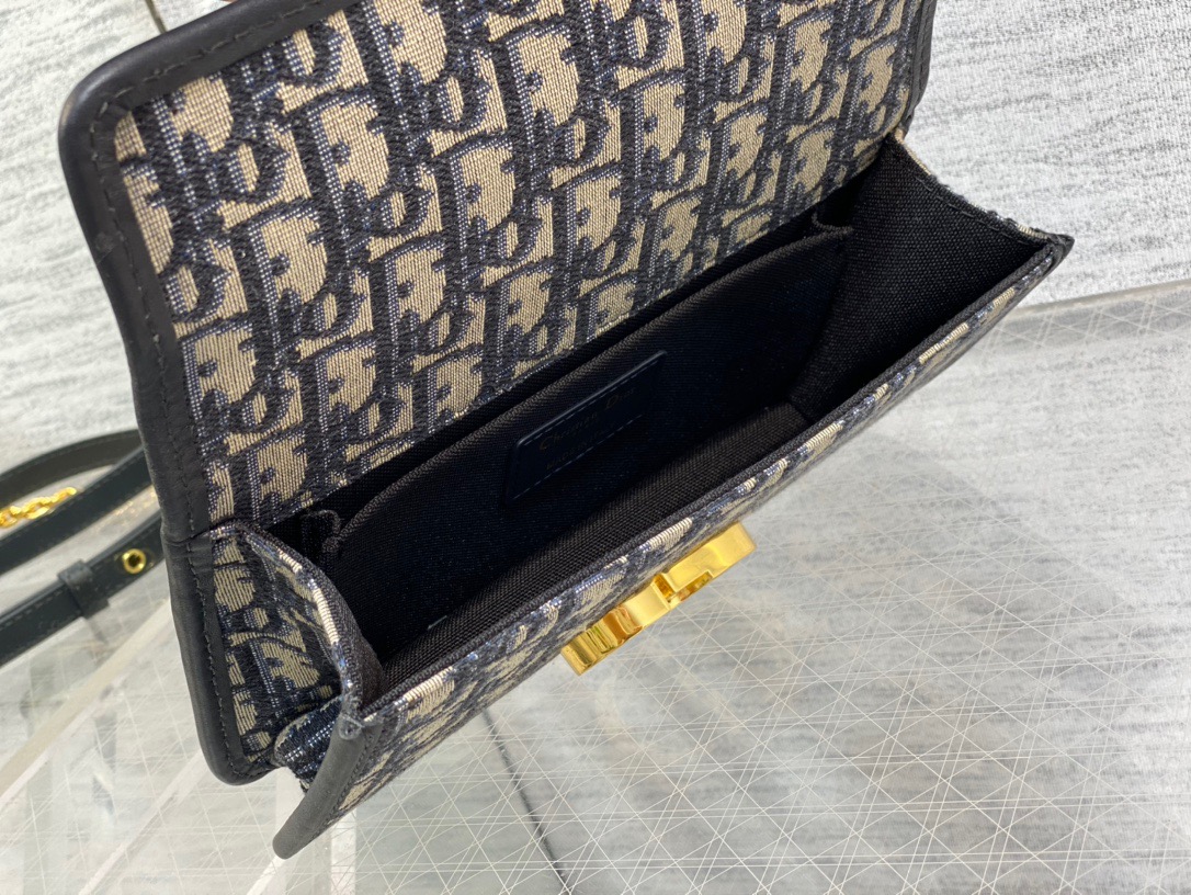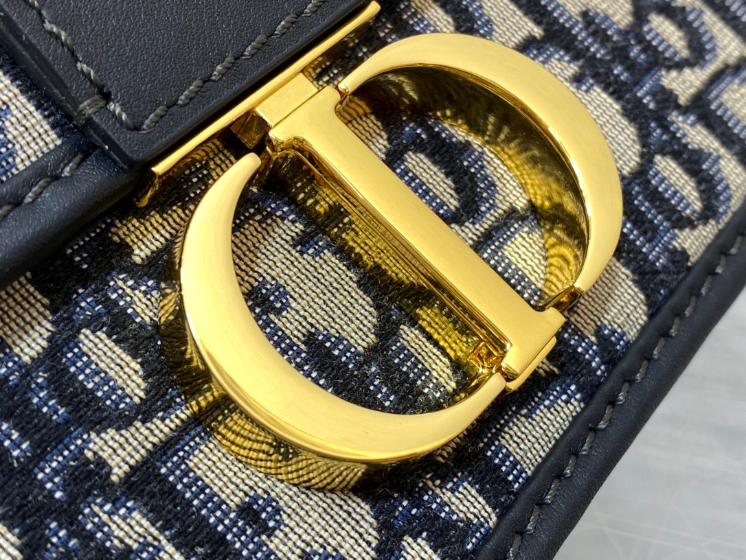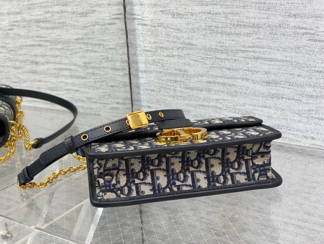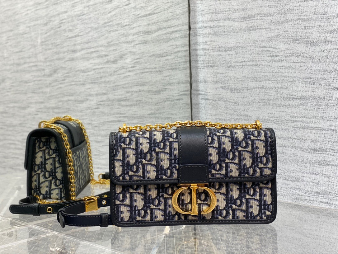 The East-West bag with chain enhances the 30 Montaigne line with a timeless and elegant design. The handbag is crafted in blue jacquard and highlights the House's hallmark Dior Oblique motif. The flap has an antique gold-finish metal CD clasp, inspired by the seal of a Christian Dior perfume bottle. Other details, like the embossed 30 Montaigne signature on the back, highlight the streamlined design. The bag features a removable chain strap with a leather insert that allows it to be comfortably carried by hand, worn over the shoulder or crossbody.