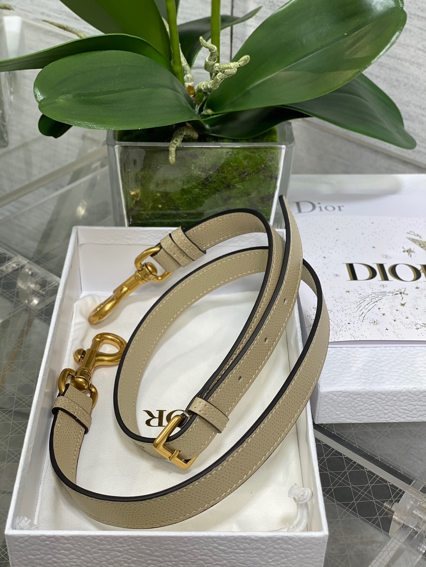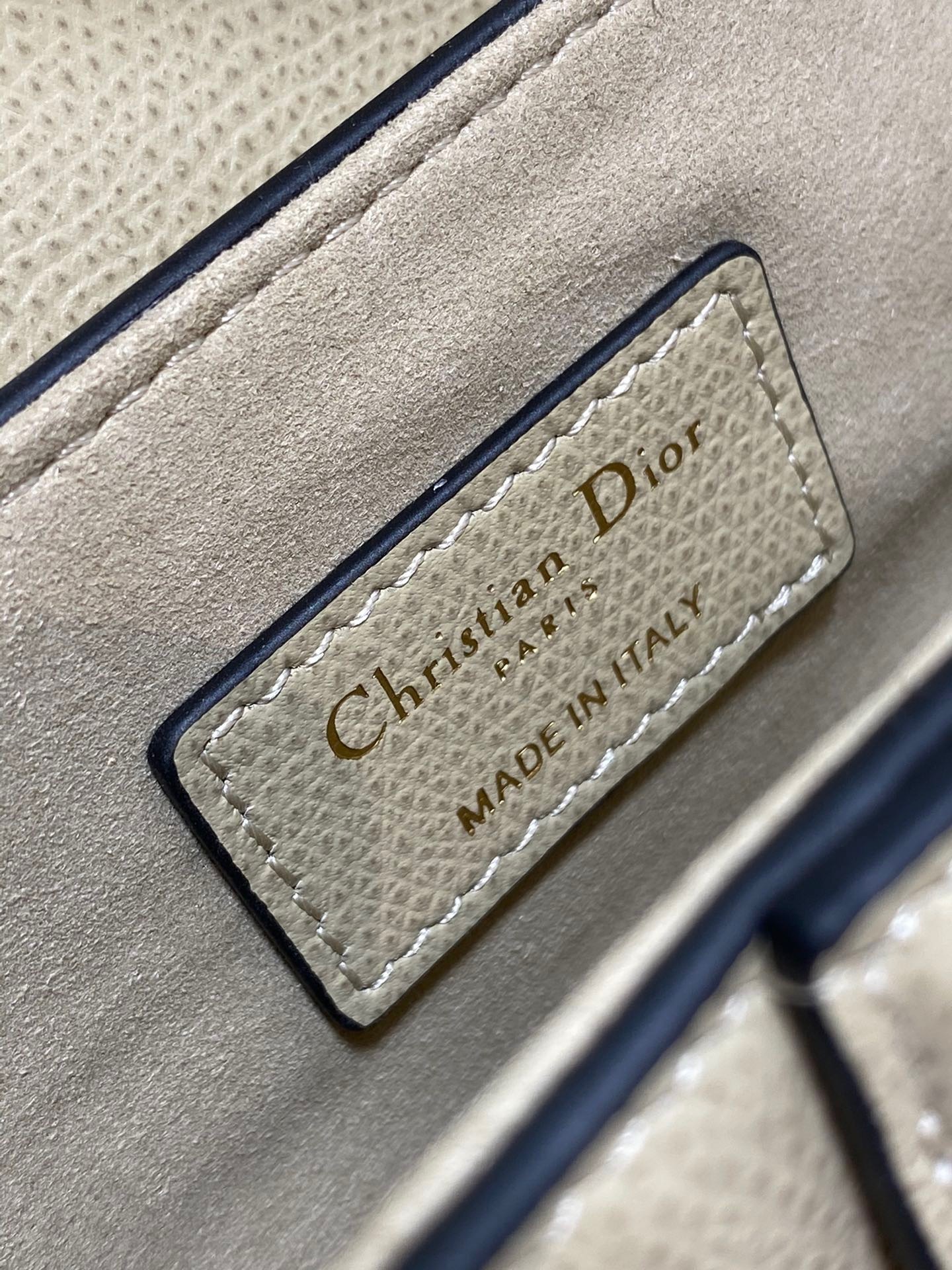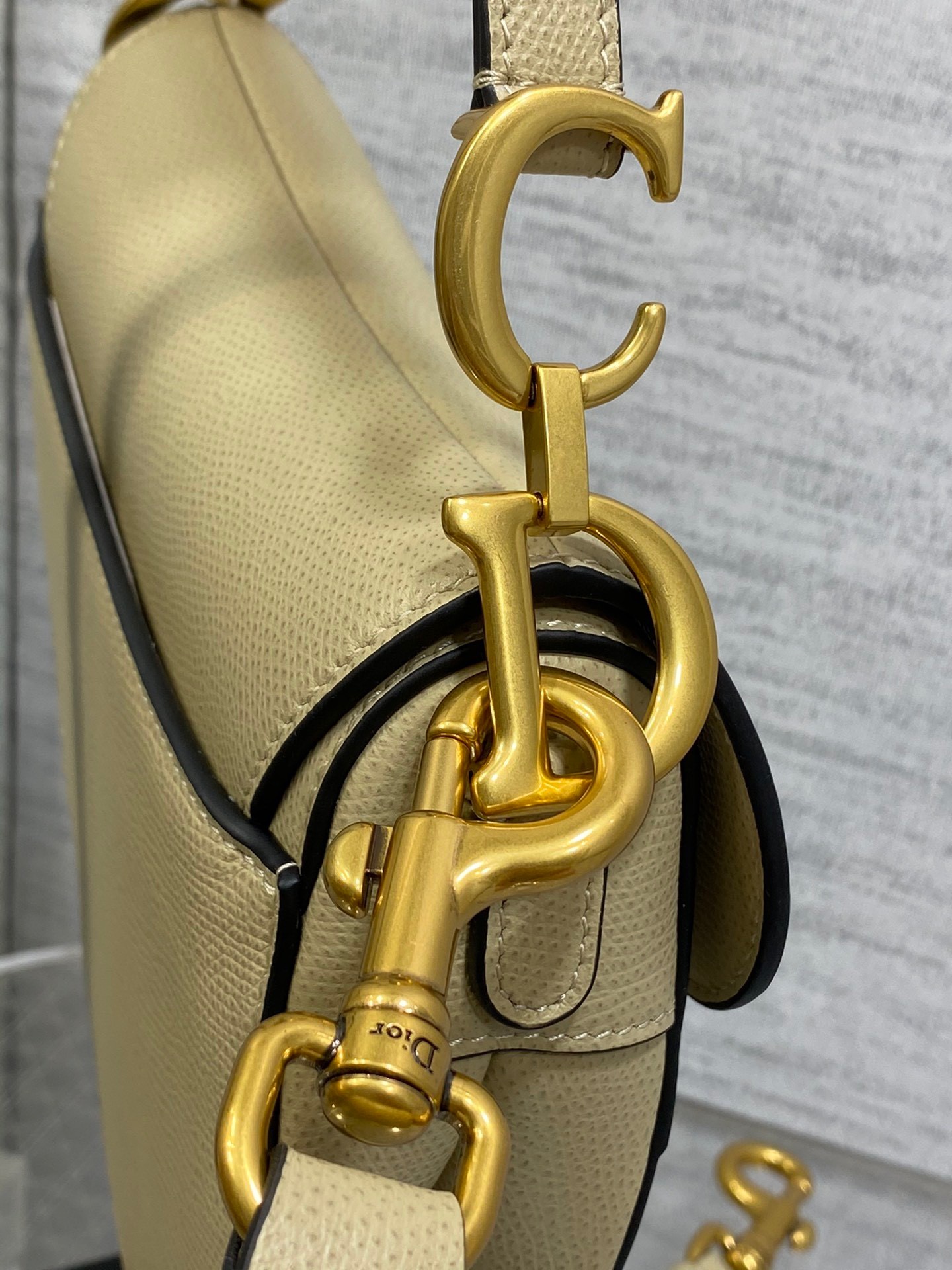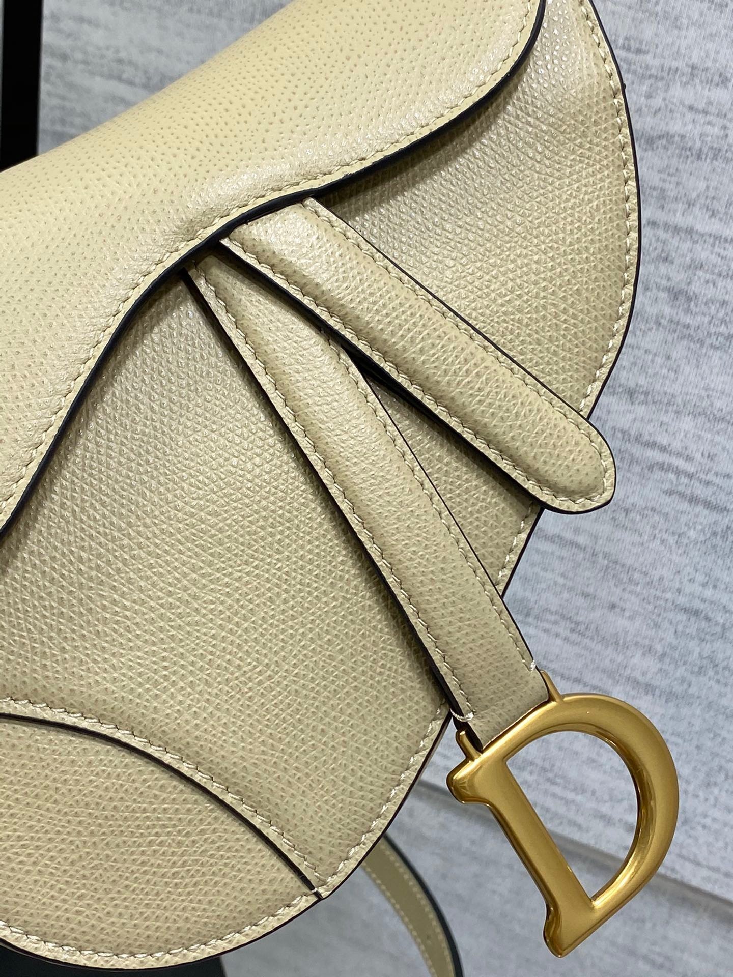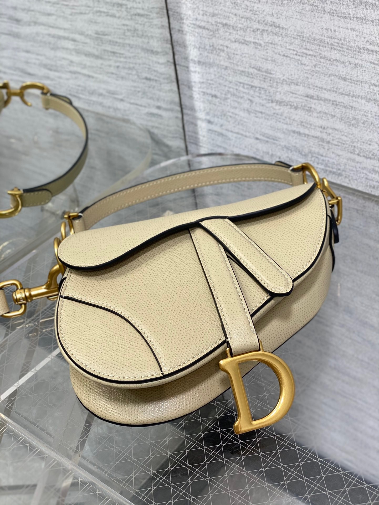 Maria Grazia Chiuri brings a fresh update to the iconic Saddle bag. Crafted in beige goatskin, the legendary design presents a Saddle flap with a magnetic D stirrup clasp, as well as an antique gold-finish metal CD signature on either side of the strap. Featuring a thin, adjustable and removable shoulder strap, the Saddle bag may be carried by hand, worn over the shoulder or crossbody.