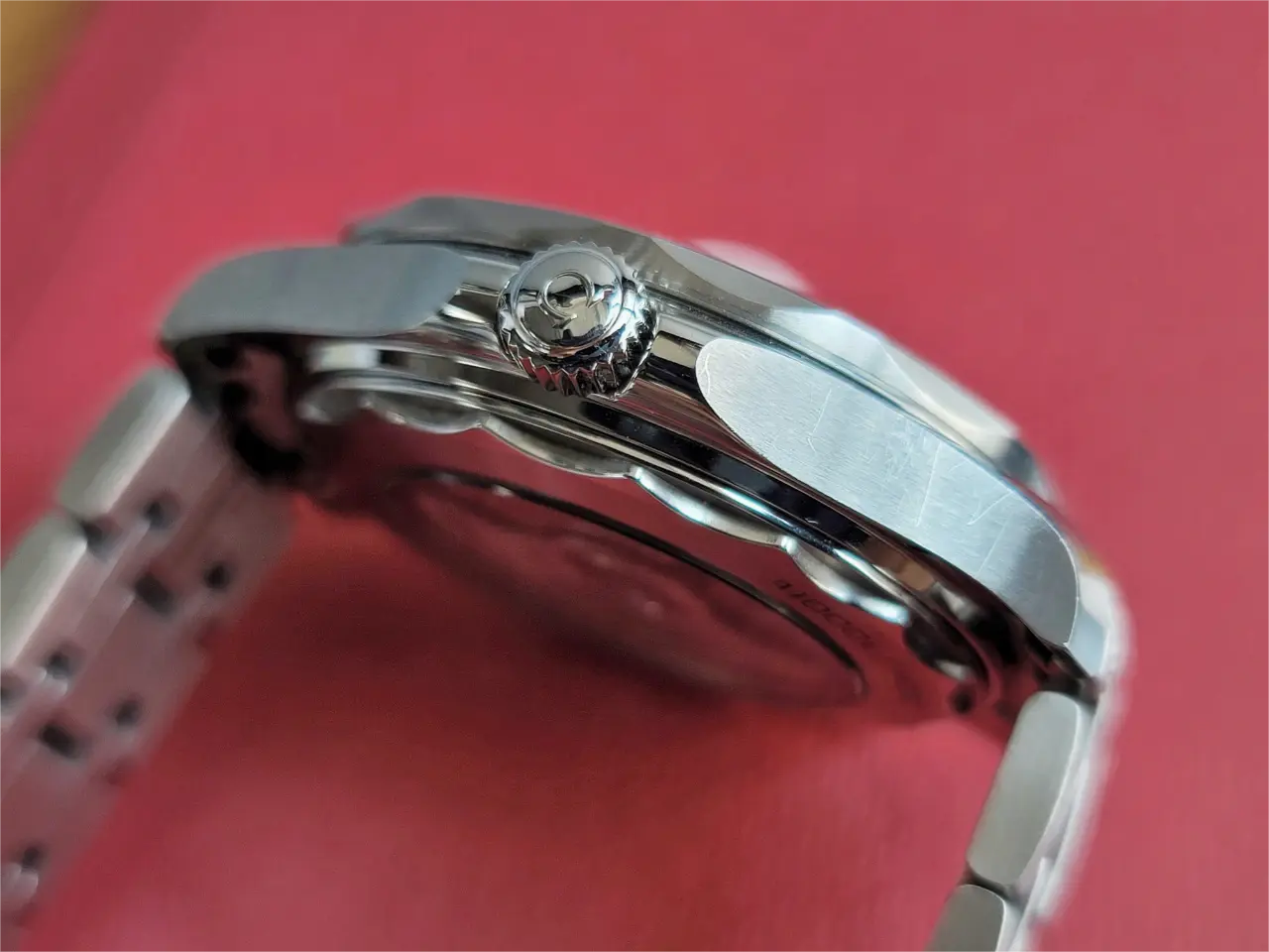 This 42 mm model is crafted from stainless steel and includes a blue ceramic bezel with a white enamel diving scale. The dial is also polished blue ceramic and features laser-engraved waves and a date window at 6 o’clock.