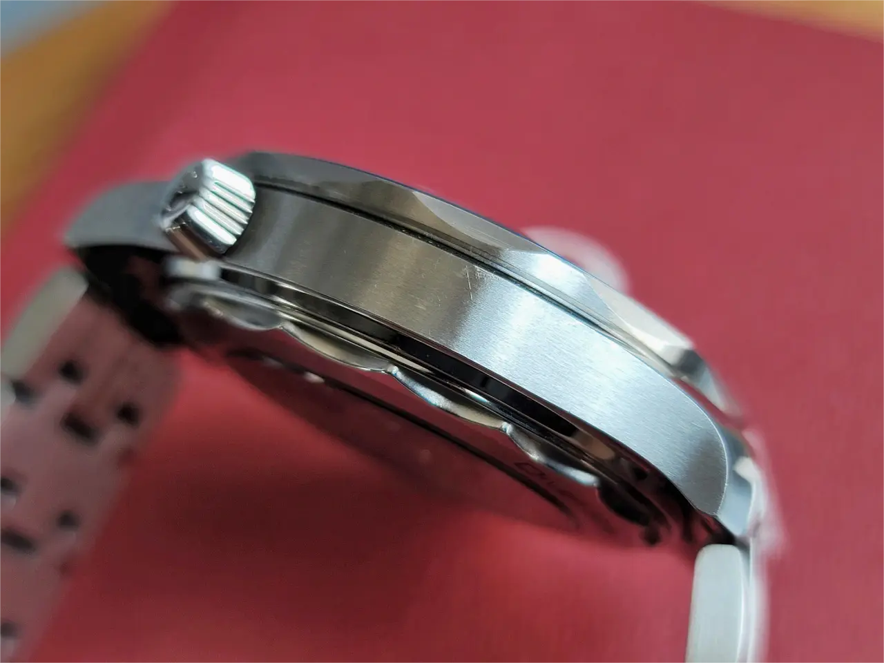 The skeleton hands and raised indexes are rhodium-plated and are filled with white Super-LumiNova, while the helium escape valve has been given a conical design.