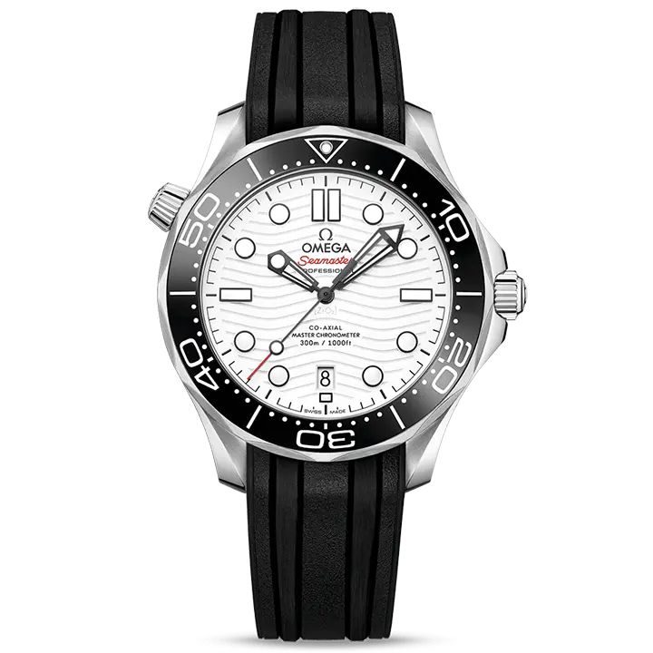 This 42 mm model is crafted from stainless steel and includes a black ceramic bezel with a white enamel diving scale. The dial is polished white ceramic and features laser-engraved waves and Seamaster highlighted in red.