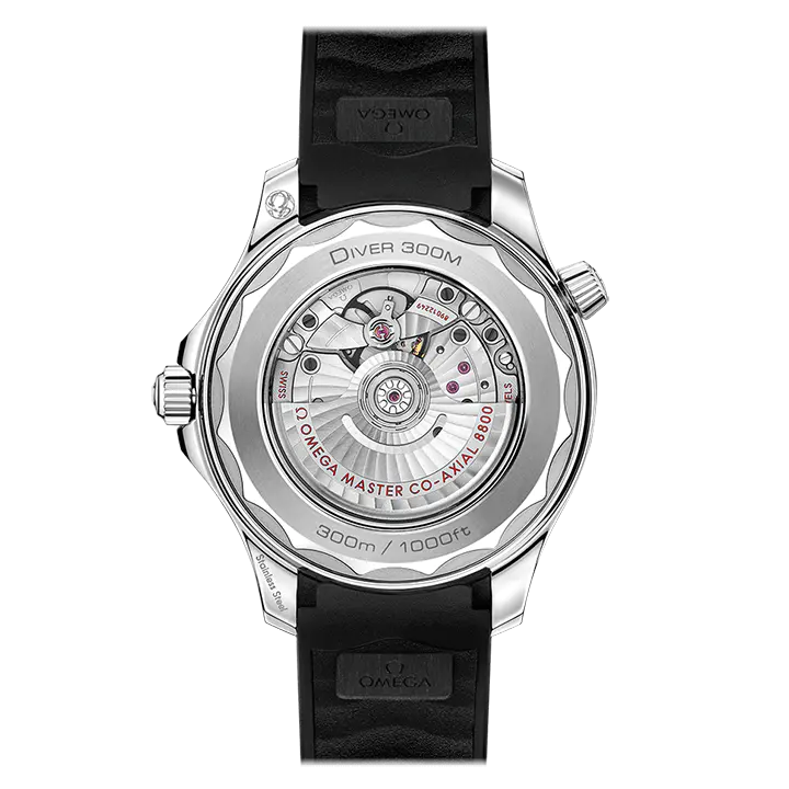 The watch is presented on an intergrated black rubber strap and is driven by the OMEGA Master Chronometer Calibre 8800, which can be seen through the sapphire-crystal on the wave-edged caseback.